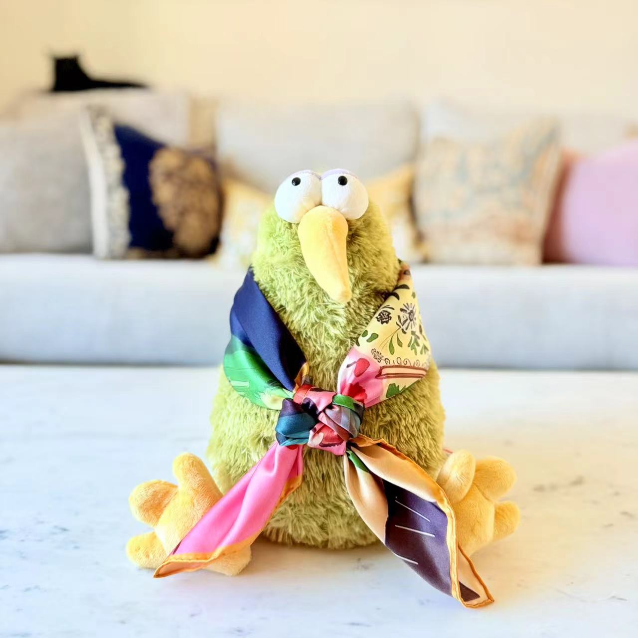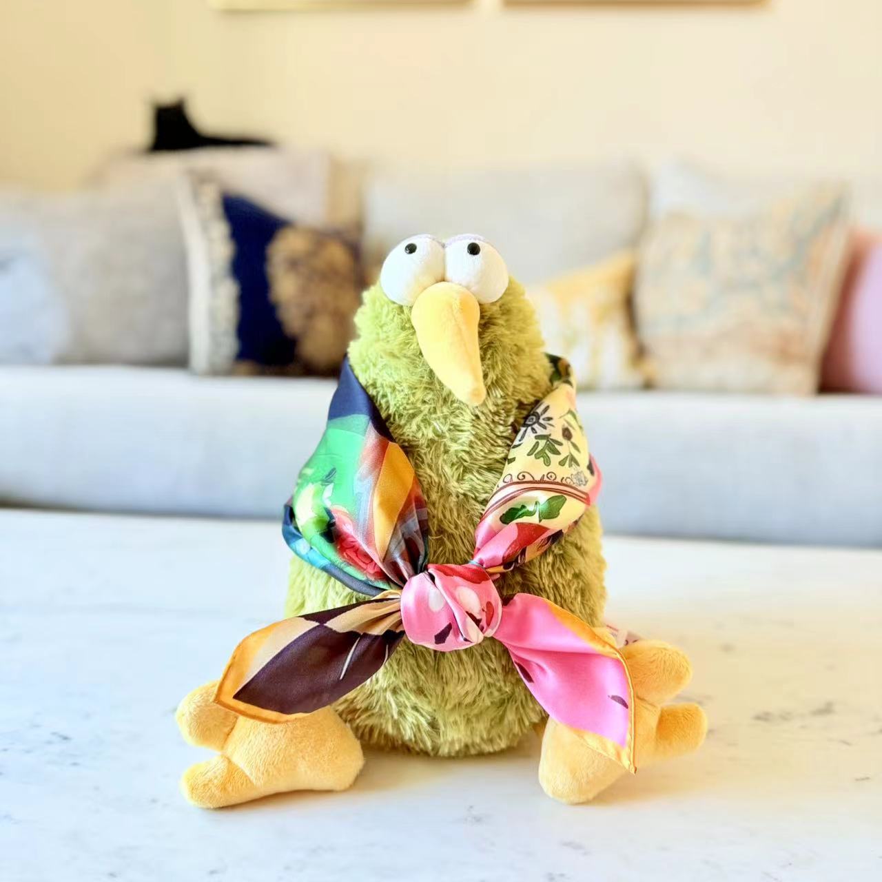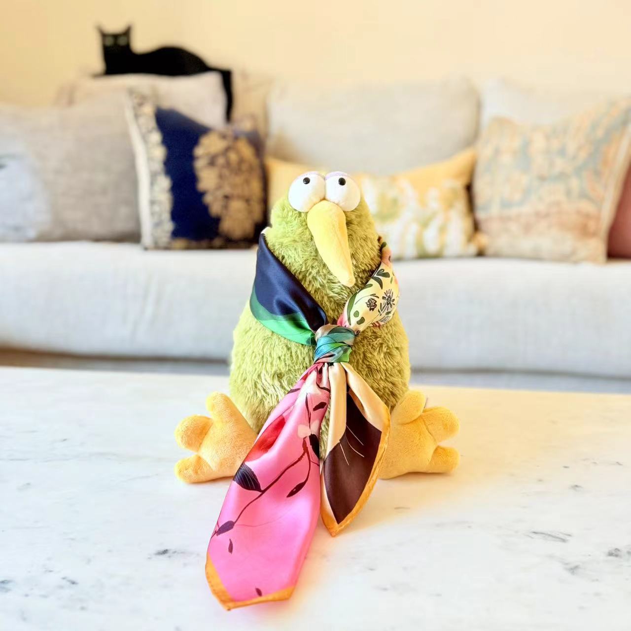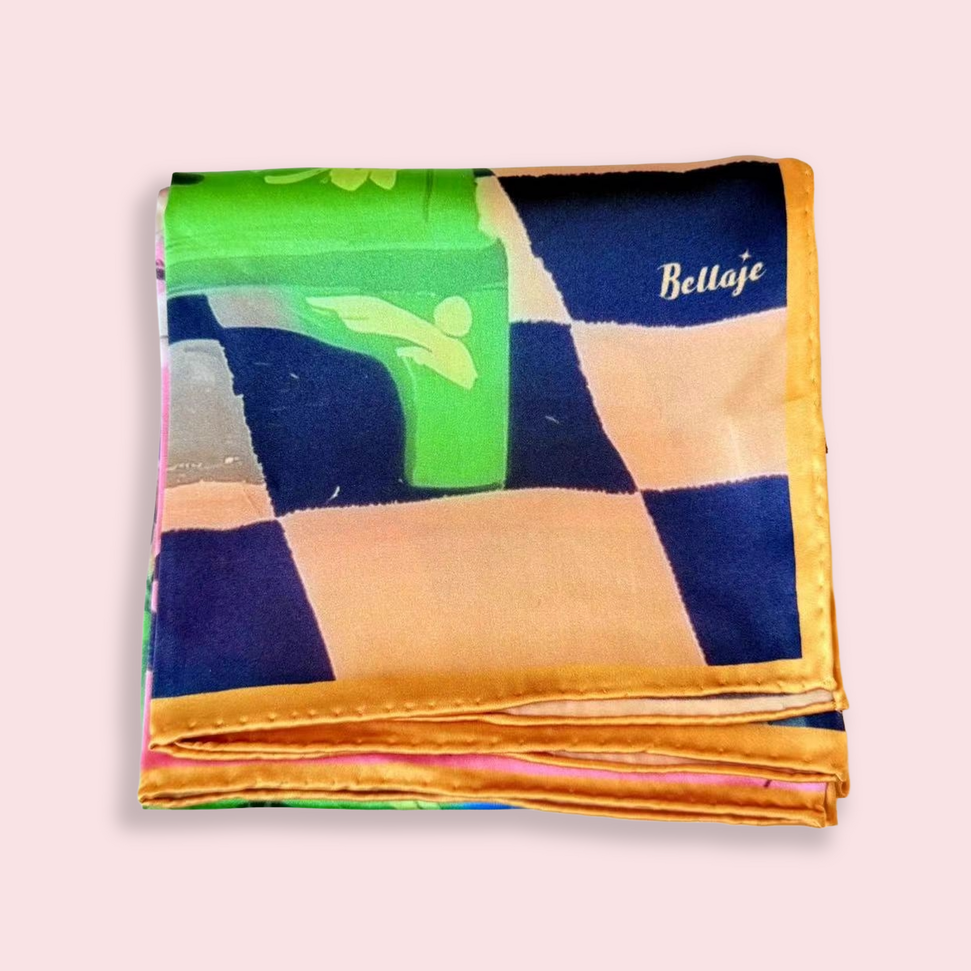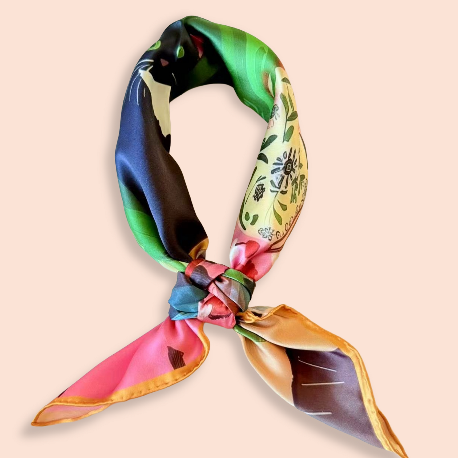 This 100% silk square scarf measures 70 by 70 cm and features luxurious satin weaves for a smooth, elegant finish. Showcasing a tuxedo cat in a colorful living room, the design is inspired by charming kid-style drawings, blending playful creativity with refined sophistication. A unique accessory that adds artistic flair to any outfit. 🐱🎨🌈